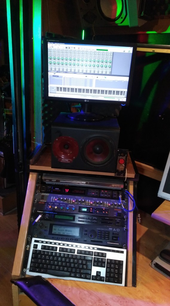 Algunos procesadores de audio analógicos, junto al sintetizador en formato modulo KORG WAVWSTATION A/D , y el clasico ROLAND U-220. En la pantalla superior de forma virtual y controlado por via MIDI el sampler GIGASTUDIO