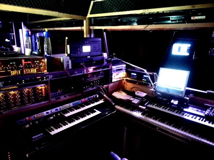 Panoramic view of the keyboard area, on the left HAMMOND B-200, on the top some processors and tube preamps.